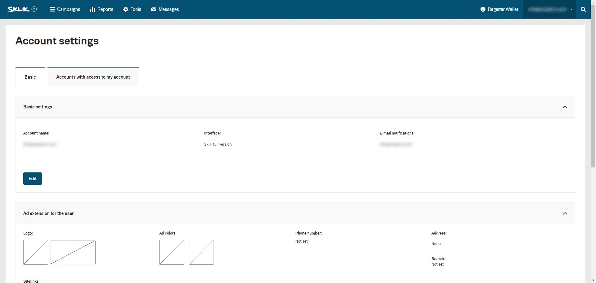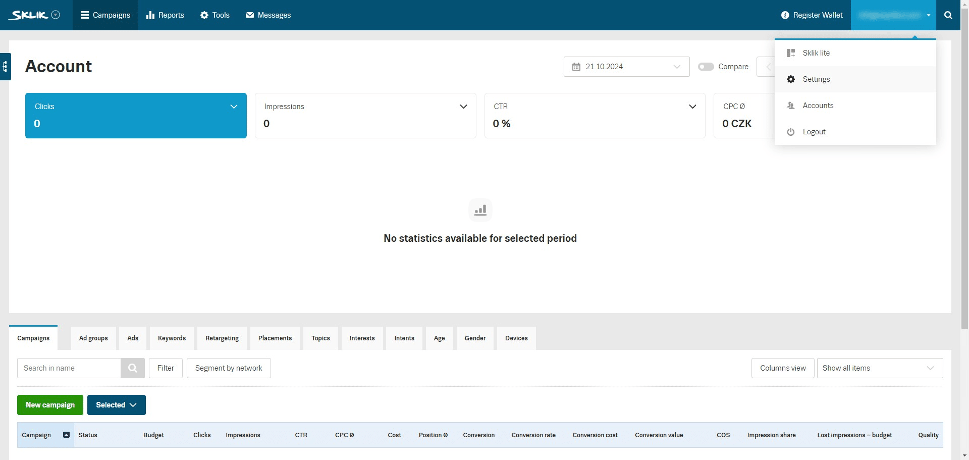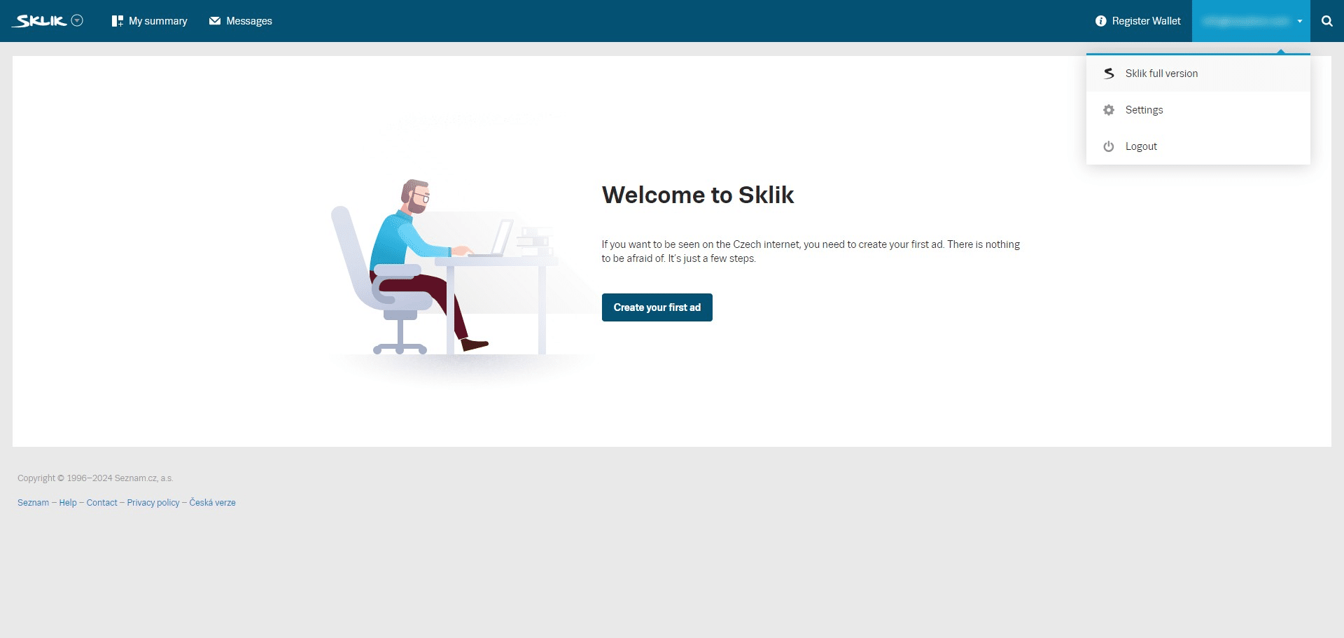 Click on your account in the top right corner and select "Sklik full version"